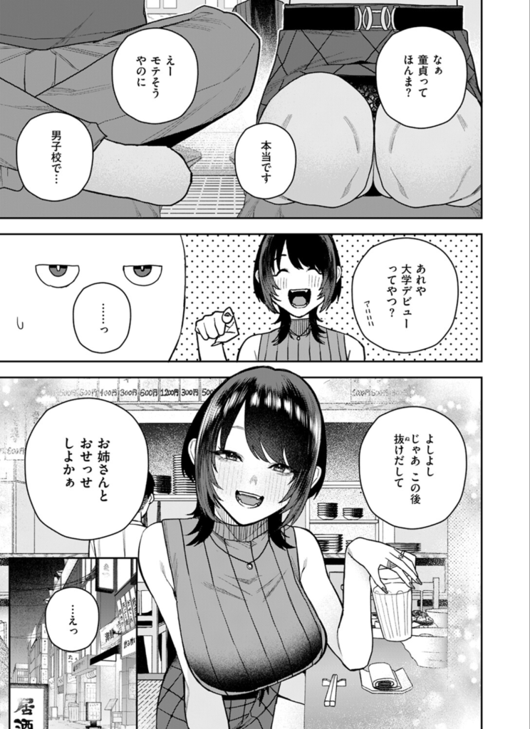 大学の新歓コンパという、喧騒と期待が入り混じる場所。そこで一人、ソフトドリンクを片手に行き場をなくしていた蛙田(かえるだ)くん。彼は大学デビューを果たしたものの、世の中の「ノリ」についていけない純朴な童貞でした。そんな彼に、獲物を見つけた猛獣のような、しかし最高に魅力的な微笑みを向ける人物がいました。