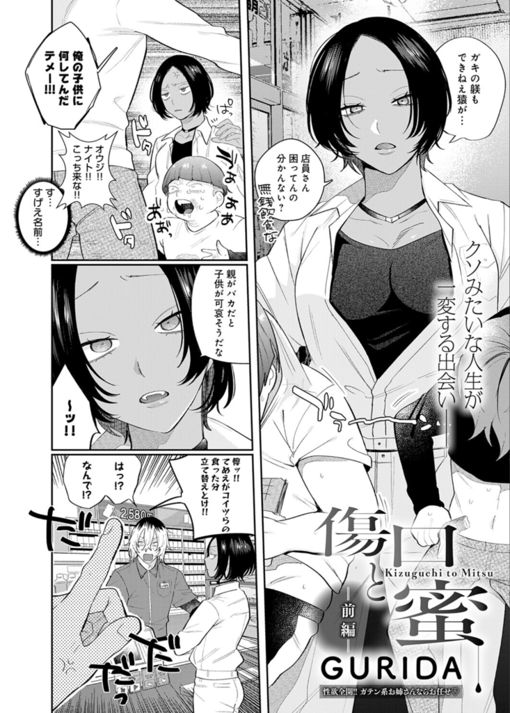閉塞感漂う田舎町、パッとしない毎日、コンビニバイトでヤンキーに絡まれる日々……。そんな絶望的な状況を、一人の圧倒的な美女が変えてくれるとしたら?GURIDA先生の最新作『傷口と蜜<前編>』は、全男子の夢を詰め込んだような逆ナン恋愛ストーリーです。