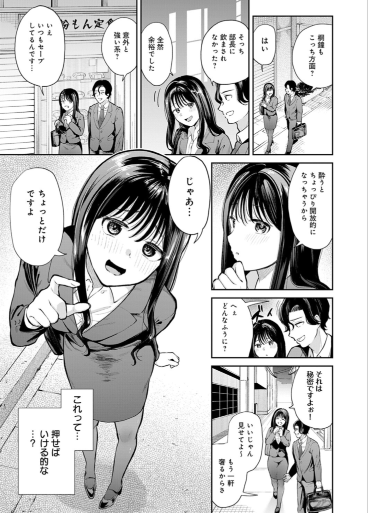 物語の主人公・笹原は、社内でも有名な元ヤリチン。彼は、誰もが羨む清楚系の美少女後輩・桐鐘さんをターゲットに定めます。「あんなにウブそうな高嶺の花、俺が調教してやるよ」と余裕綽々で二次会に誘い出す笹原。驚くほどすんなりとホテルへ持ち込むことに成功し、勝利を確信した彼が彼女の服を脱がせると、そこには目を疑うような光景が広がっていました。清楚な服の下に隠されていたのは、およそウブとは程遠い、超攻撃的なランジェリー。そして、笹原を待っていたのは、彼が想像もしていなかったほど濃厚で過激なビッチによる「搾精」の儀式だったのです。