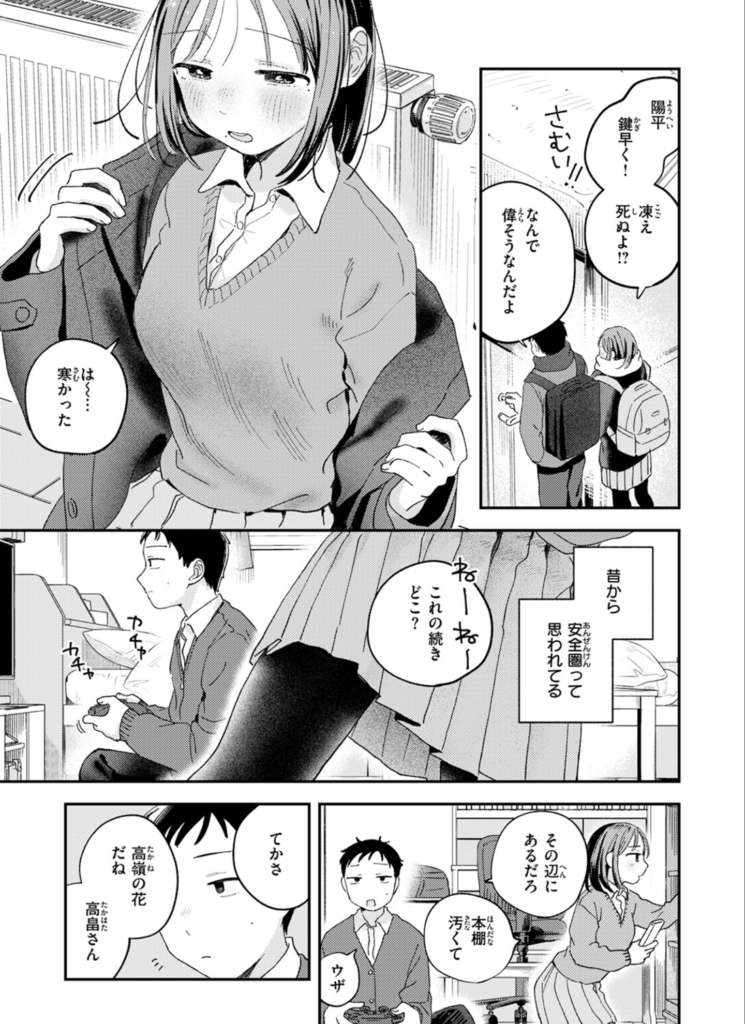 違う学校に通う幼なじみの千明(ちあき)と俺。昔から何でも言い合える「安全圏」の関係で、俺は千明に「他に好きな女のコがいる」と嘘をつき、彼女もまた俺を雑に扱う、そんな日常が続いていました。しかしある日、千明が突然、衝撃的な告白をします。「先輩とエッチした」。その瞬間、俺の心は激しく動揺し、平穏を装うことができなくなります。動揺する俺を見て、さらに挑発的な態度をとる千明。言葉では悪態をつきあいながらも、二人の顔はいつの間にか至近距離に……。