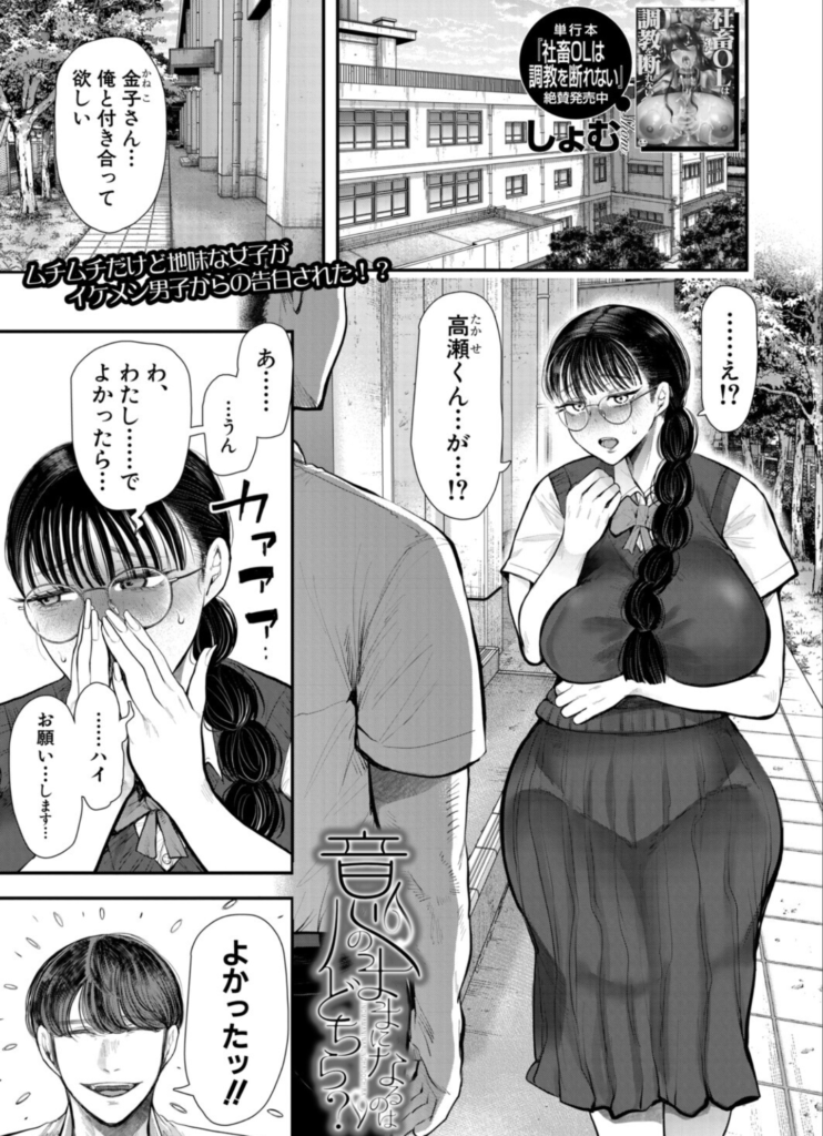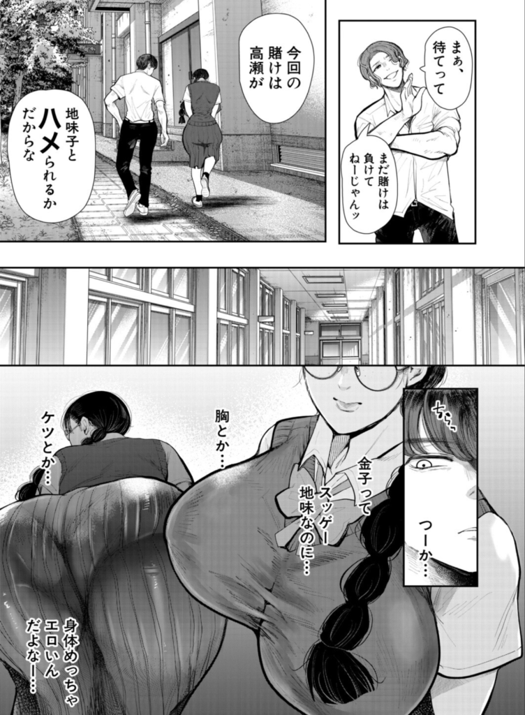 男子学生の高瀬は、クラスメイトとの悪ふざけのような賭けに挑みます。ターゲットは、クラスでも目立たない地味なめがね女子、金子さん。彼女とSEXできるかどうかの勝負に、高瀬は余裕の表情で近づきます。思惑通り、付き合う流れに持ち込み、「あとはヤるだけ」と高を括っていた高瀬。しかし、二人きりの密室で金子さんが見せたのは、想像を絶する豹変でした。